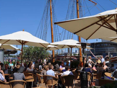 During the summer, the terrace dining is opened with views of the harbour and the hotel’s 3 vintage schooner ships.
